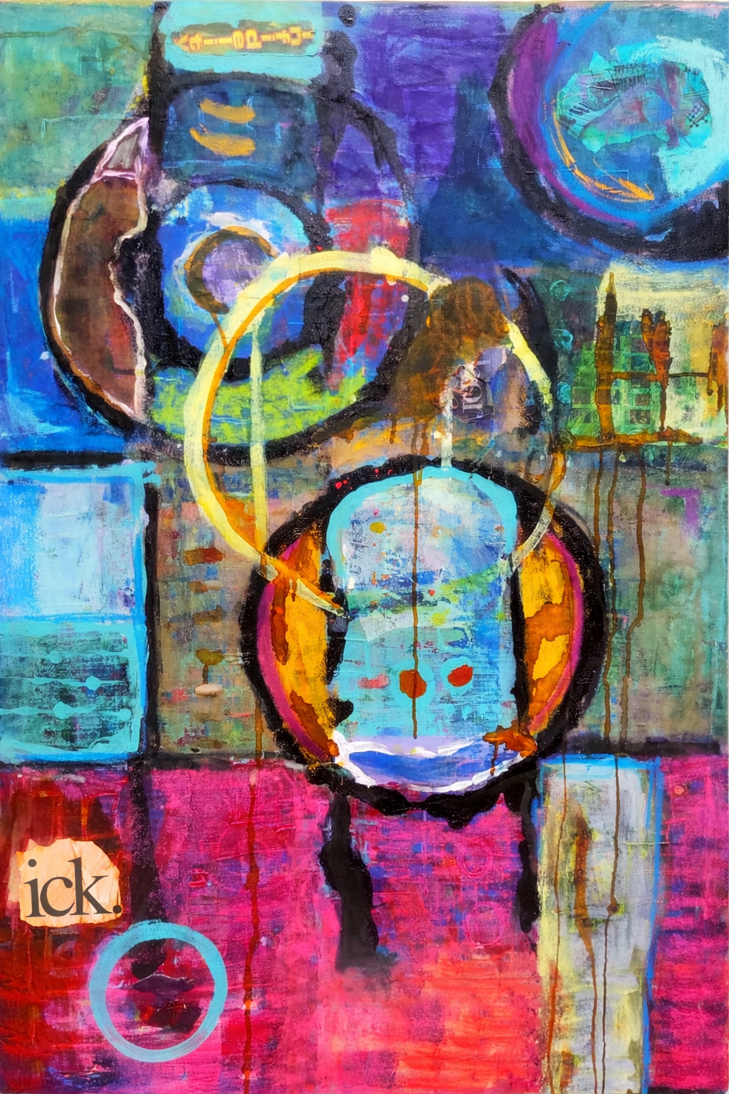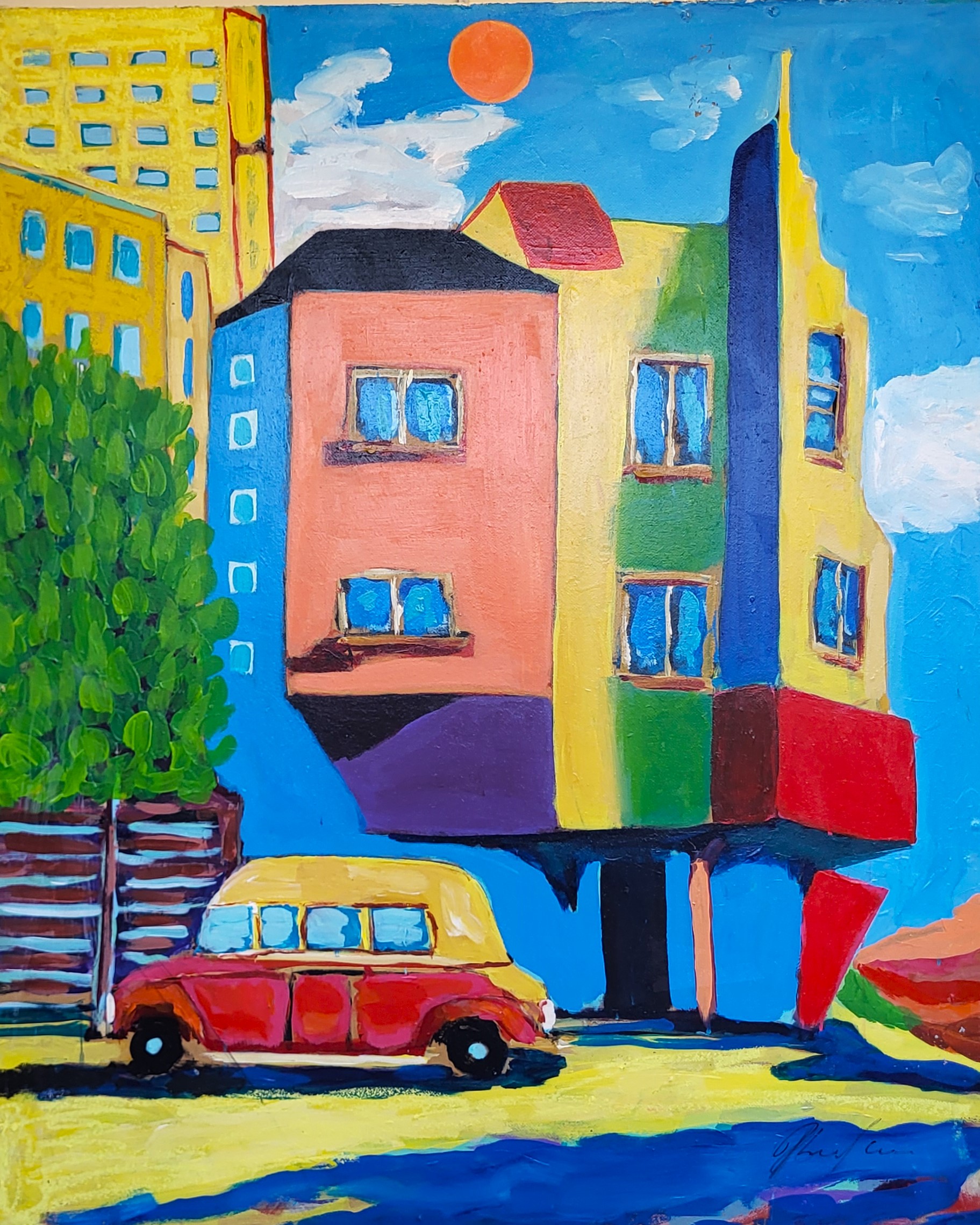 Bold blocks of orange, teal, and gold form a sun washed row of buildings, while a vintage car idles in the foreground. Shadows stretch across the road, hinting at late day calm. The world here feels paused, holding its breath before the evening glow.
